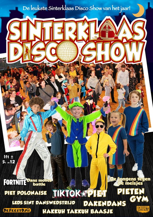 De Sinterklaas Disco Show is een 90 minuten durende all-in interactieve show vol interactief entertainment voor kinderen van ±4 t/m 12 jr. De Sinterklaas Disco Show heeft een hoog meezing en meedoe gehalte.