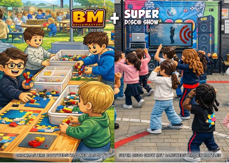 Dag entertainment voor 1 prijs. Start in de ochtend of middag met de Brickmasters bouwwedstrijd net als op tv, en sluit de avond met de Super Disco Show. De Brickmasters bouwwedstrijd en de Super Disco Show zijn geschikt voor de leeftijden van ±6 t/m 12 jr.
